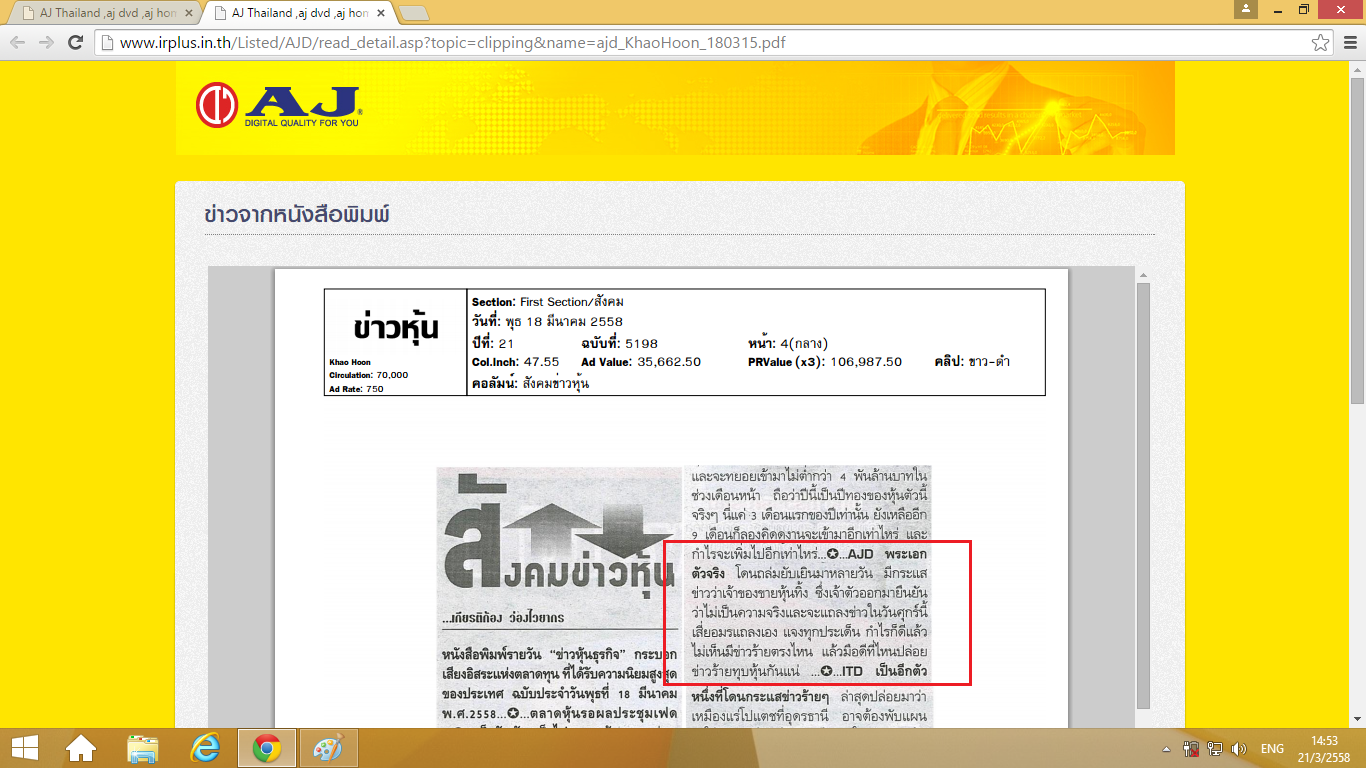 AJD แจ้งว่าในวันจันทร์ที่ 28 มี.ค. นี้ บริษัทฯจะจัดงานแถลงข่าวเป็นตัวแทนผู้ให้บริการเว็บไซต์ Alibaba ในไทย
