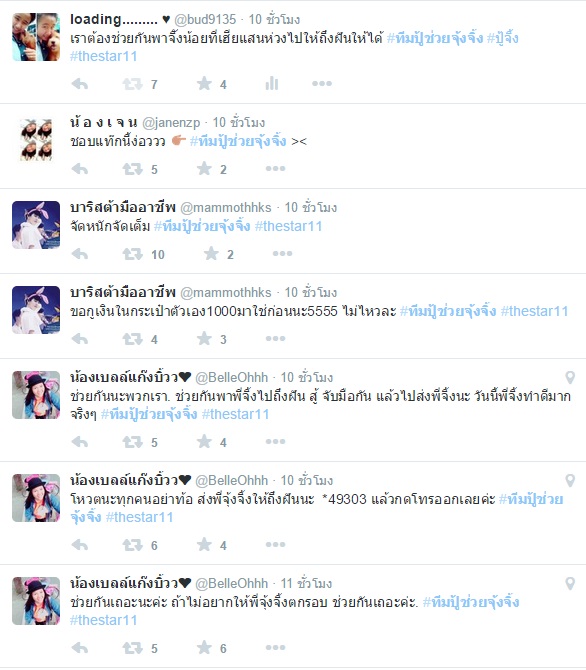 เห็นในทวิตมี #ทีมปู้ช่วยจุ้งจิ้ง คือน่ารักอ่ะ ชอบๆๆๆ ขออยู่ทีมนี้นะคะ เรามาช่วยกันสานฝันให้จิ้งน้อยเถอะ ให้อยู่ตามความฝันให้เฮียก่อน ช่วยกันนะคะ ทั้ง