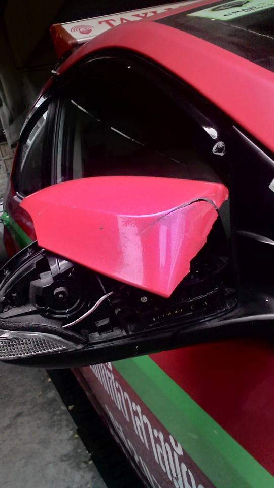 เมื่อรถเคลื่อนตัวออก แท็กซี่ยังไม่ทันจะขยับ(ดูในคลิป) มีรถฮอนด้าแอ๊คคอร์ด ขับมาเฉี่ยวกระจกข้างเสียหายตามรูป