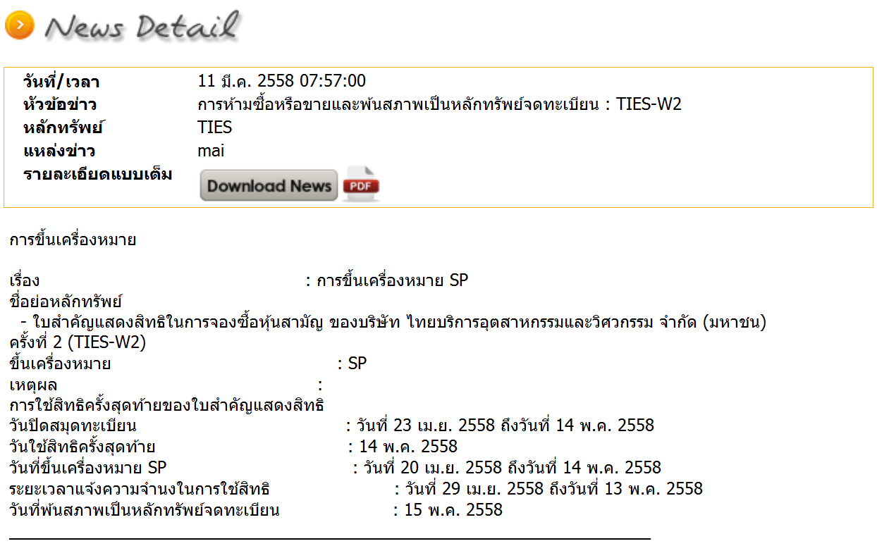 TIES-W2 : ซื้อขายวันสุดท้าย 17 เมษายน 2558