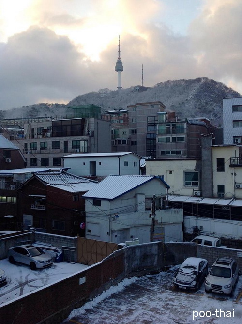 ทำไมถึงต้องกลิ้งๆตะลุยเกาหลี ต้องบอกก่อนว่าพลอยเป็นผู้หญิงตัวกลมๆค่ะ จึงเป็นที่มาของการตะลอนกลิ้งเที่ยวเกาหลี เพราะการเที่ยวด้วยตัวเองไม่ได้มีราชรถมารอรับ-ส่ง เหมือนเที่ยวกับทัวร์ ต้องเดินจริง วิ่งจริง ไหนจะขึ้นเนิน เปลี่ยนสายรถไฟ บางสถานีเปลี่ยนไกลจนนึกว่ามาแข่งมาราธอนเลยค่ะ กระทู้นี้ต้องขออภัยถ้ามีรูปพลอยเยอะเกินนะคะ…วิวจากหน้าต่างห้อง 501 มองออกไปก็จะเห็นหอคอยอยู่ใกล้ๆมองเห็นเคเบิลคาร์วิงขึ้นลง