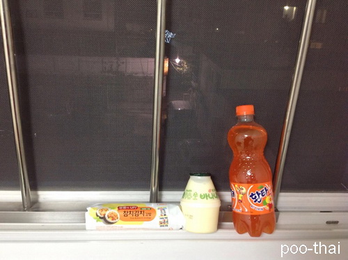 ในห้องไม่มีตู้เย็นนะคะแต่ไม่ต้องกลัวว่าอาหารจะเสียหรือเครื่องดื่มจะไม่เย็นชื่นใจเพียงแค่คุณว่างไว้แบบนี้ก็เหมือนออกมาจากตู้เย็น…..คิมบับยี่ห้อนี้อร่อยมาก ถูกปาก โดยเฉพาะรสทูน่ากิมจิ