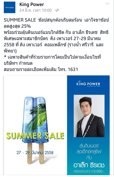 เอาอีกแล้วโปรโมชั่นล่อเป้า King Power SUMMER SALE ของลดราคา 25% เห็นโฆษณาที่เป็นจอตามสี่แยก เลยต้องรีบเข้า FB ดูเพราะคุ้นๆ ว่า 27-29 มีนา ที่เค้าเปิดให้ช้อปได้ ตอนนี้ยังพอมีเวลาตัดสินใจซื้ออีก 2 วัน พร้อมเงินโบนัสในกระเป๋าเพิ่งออกวันนี้เลยจ้า (เพื่อนหลายบริษัทออกตอนปลายปี แต่บริษัทเราเค้าเก็บพนักงานไว้กลัวลาออก เลยมาออกเดือนมีนาพร้อมเงินเดือนขึ้น...อันน้อยนิด 555) มีเงินก็เก็บด้วยแต่ก็ใช้ด้วยให้เป็นรางวัลของตัวเอง งั้นขอแอบไปดูก่อนว่ามีสีที่อยากได้มั้ย โดยส่วนใหญ่ชอบไปที่ศรีวารีเพราะค่อนข้างใหญ่เลยก็ขับรถเปลี่ยนบรรยากาศไปแถวนั้นบ้าง แต่วันนี้เนื่องจากไปเล็งของเห็นนั่งพิมพ์เวิ่นเว้อเดี๋ยวจะไม่ทัน คงต้องนั่งรถไฟฟ้าจากสาทรไปที่รางน้ำดูเที่ยงนี้เลย เดี๋ยวไปดูแล้วจะอัพเดทให้ว่ามีของอะป่าว