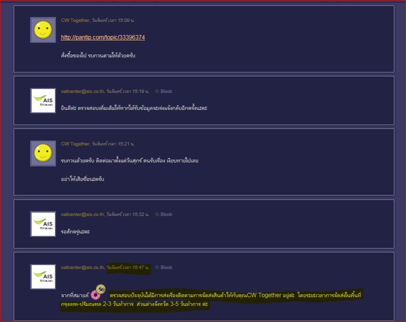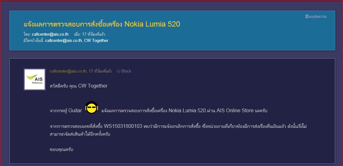 4. AIS ตอบหลังไมด์ (ตามรูปที่ 3) ว่ายกเลิกการสั่งซื้อ โดยไม่ได้โทรแจ้งลูกค้า