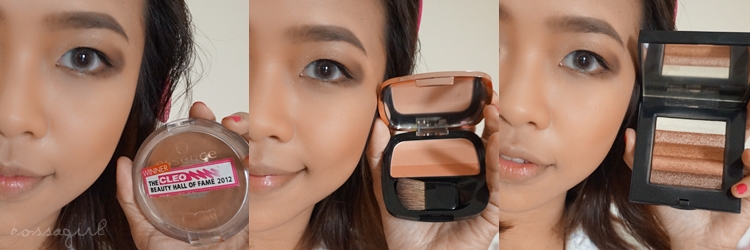 - ปัด brick bronze บริเวณโหนกแก้มถึงกกหูเลยค่ะ แล้วใช้สีน้ำตาลทองไลท์ดั้งใช้สีขาวไลท์ใต้ท้องคิ้ว ใต้ตา และปลายคางค่ะ