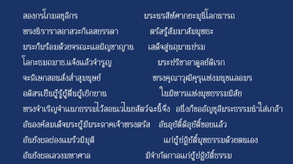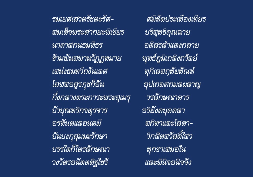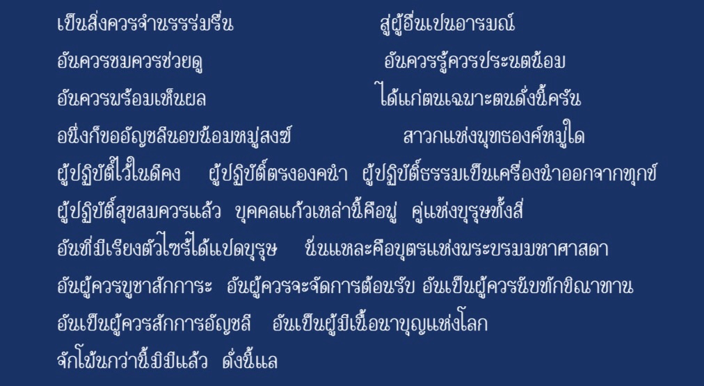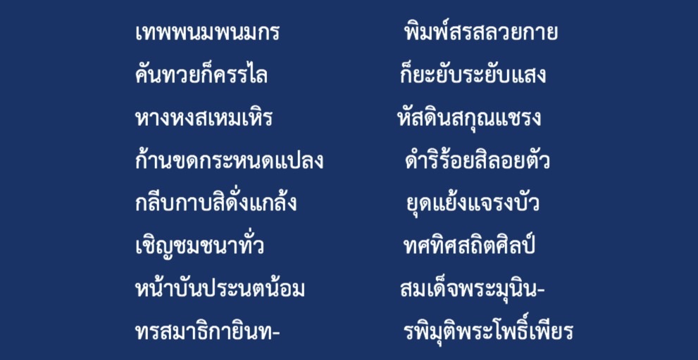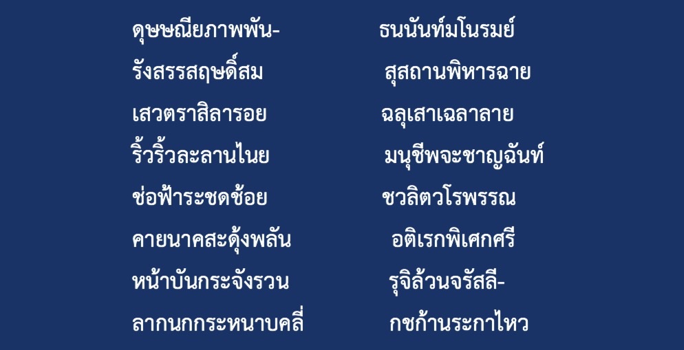 ระลอกคลื่นระรวนเร..ชลเห่ระรวยริน แบบแบบแหบจะยิน..ห่อนโกรธกดยังหวนโหย เลวคลองสำรอกคลื่น..พละอื่นก็อวดโอย เร่าเร่าจะโกยโกย..อันอื่นอกก็อดใจ ริ้วเยือนล้วนร้ายริ้ว..แลร้าวผิวยังไหวไหว หาดเหือดต้องหดให้.