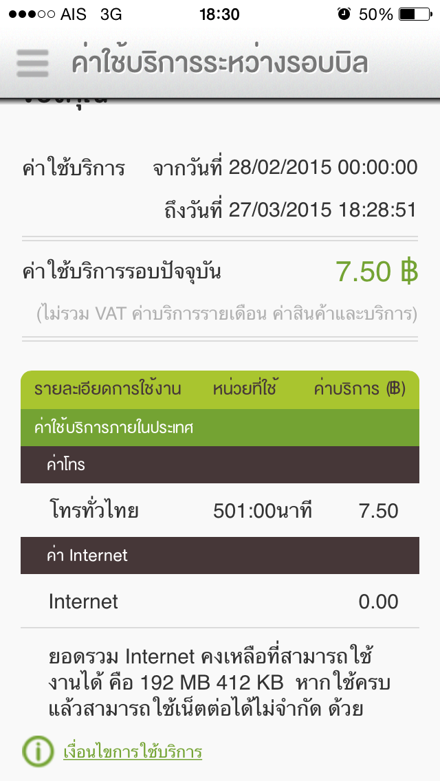 ส่วนเกินนาทีละ 1.50 บาท เกินไป 1 นาที คิด 7.50 บาท ตรวจสอบจาก eservice ระบบคิดค่าบริการโทรครั้งล่าสุด 5 นาที คิดเป็น 7.50 บาท ไม่มีการโทรหมานเลขพิเศษ