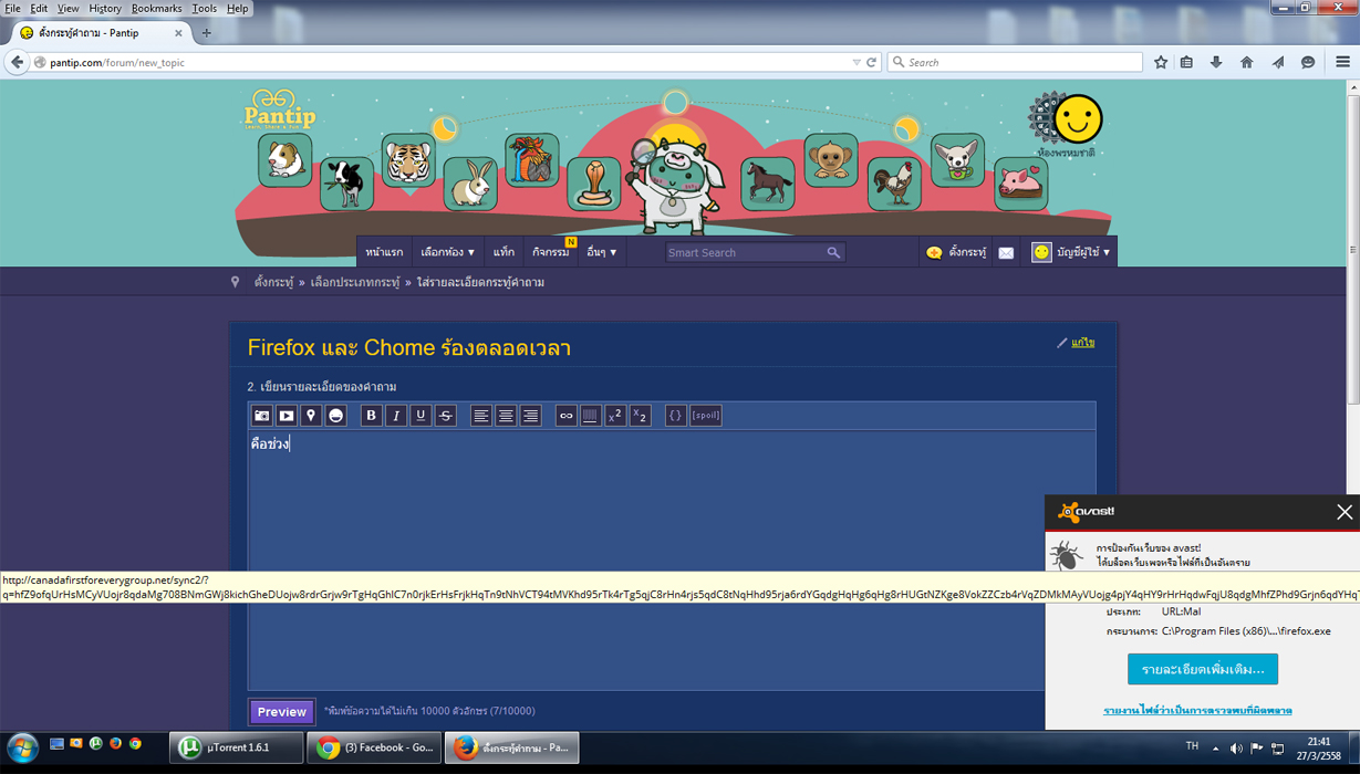 ผมมาขอทางแก้ไข กรณีภาพในเว็บไม่แสดงผลภาพครับ เมื่อเข้าเว็บแล้ว โปรแกรม avast! ขึ้นภาพแจ้งเตือนมาดังนี้ครับ (ตามไฟล์ภาพที่แนบมา) รบกวนขอความรู้เพื่อแก้ไข เป็นวิทยาทานด้วยครับผม ^^ หมายเหตุ: ลิ้งค์ขอ