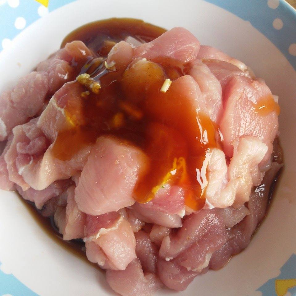 2.หั่นเนื้อหมูส่วนที่ชอบ(ไก่หรือเนื้อก็ได้คะ) ปรุงรสด้วย รสดี+ซีอิ๊วขาว+น้ำมันหอย