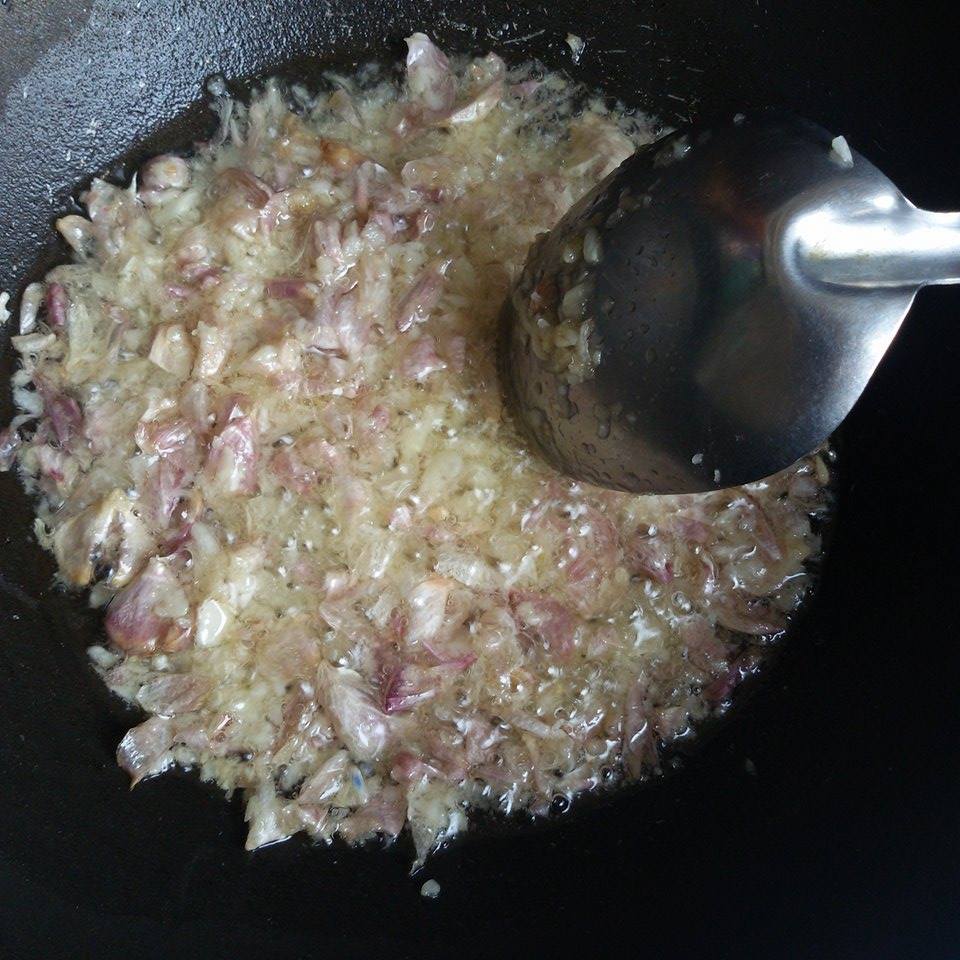 3.นำกระเทียมที่โขลกไว้ผสมน้ำปลาเล็กน้อยและตั้งน้ำมันให้ร้อนใส่กระเทียมลงไป