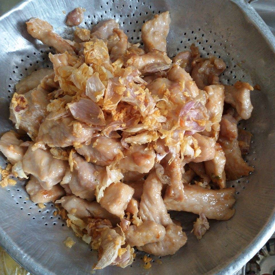 5.อย่าพึ่งทิ้งน้ำมันที่เจียวกระเทียมหลังจากเอากระเทียมขึ้นให้ใส่หมูที่เราหมักลงไป