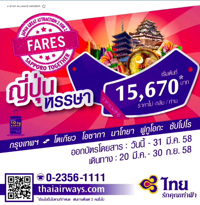 การบินไทยออก promotion เขย่าตลาดญี่ปุ่นอย่างต่อเนื่อง ด้วยการต่อ Promotion Japan Great Attraction 2 กับราคาที่เบากว่าเดิมอีก หมื่นห้ากว่าๆเท่านั้นเอง จะเลือกบินเข้าออกเมืองไหนก็ได้ เพราะมีให้เลือกตั้ง