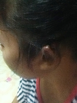 อาจจะมองไม่ชัดมากค่ะ เราเย็บแล้วหมอบอกที่กกหู 5 เข็ม เนื้อฉีกก็เจ็บนะ แต่เจ็บที่พ่อทำแบบนี้มากๆๆ