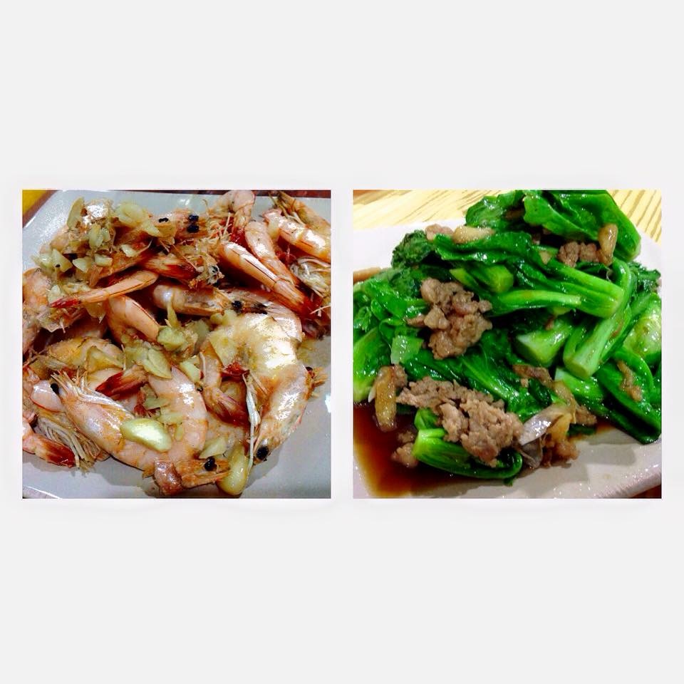 1. กุ้งอบเนยซอสกระเทียม + แขนงหมูสับผัดน้ำมันหอย
