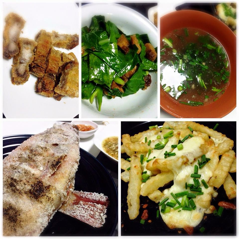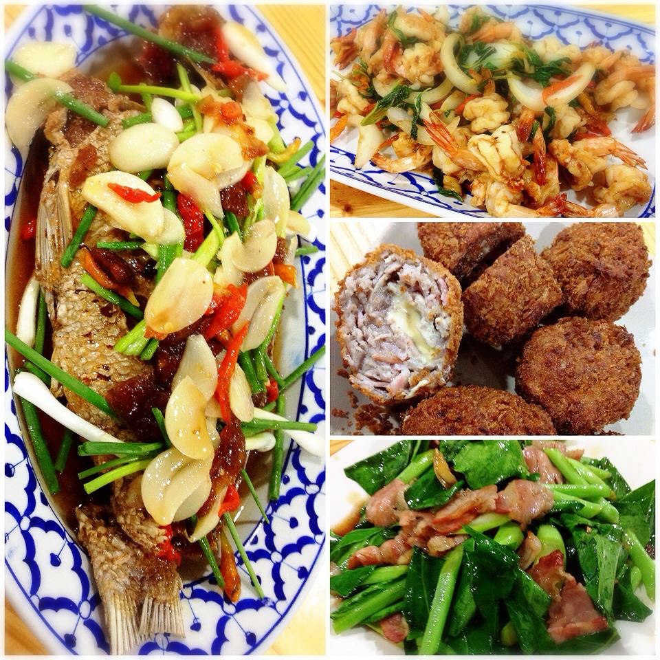 15. ปลากะพงทอดราดซอสมะขาม + ผัดคะน้าเบค่อน + ไข่มังกรซ่อนชีส (ชื่อเมนูแปลกๆเริ่มมา 55+ ) + กุ้งผัดพริกสด