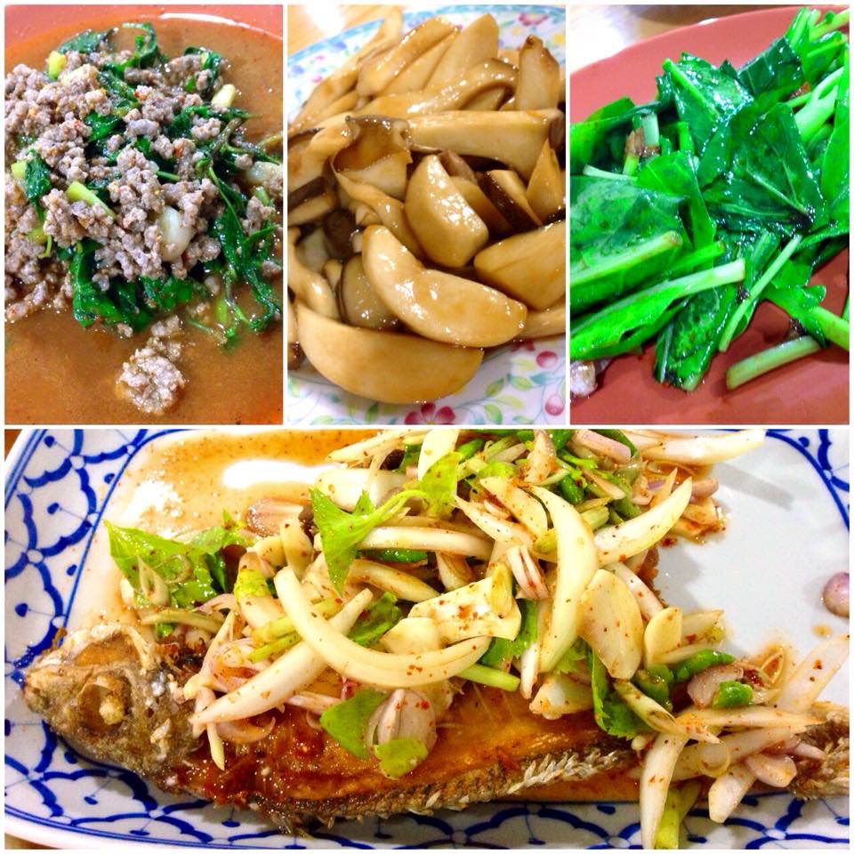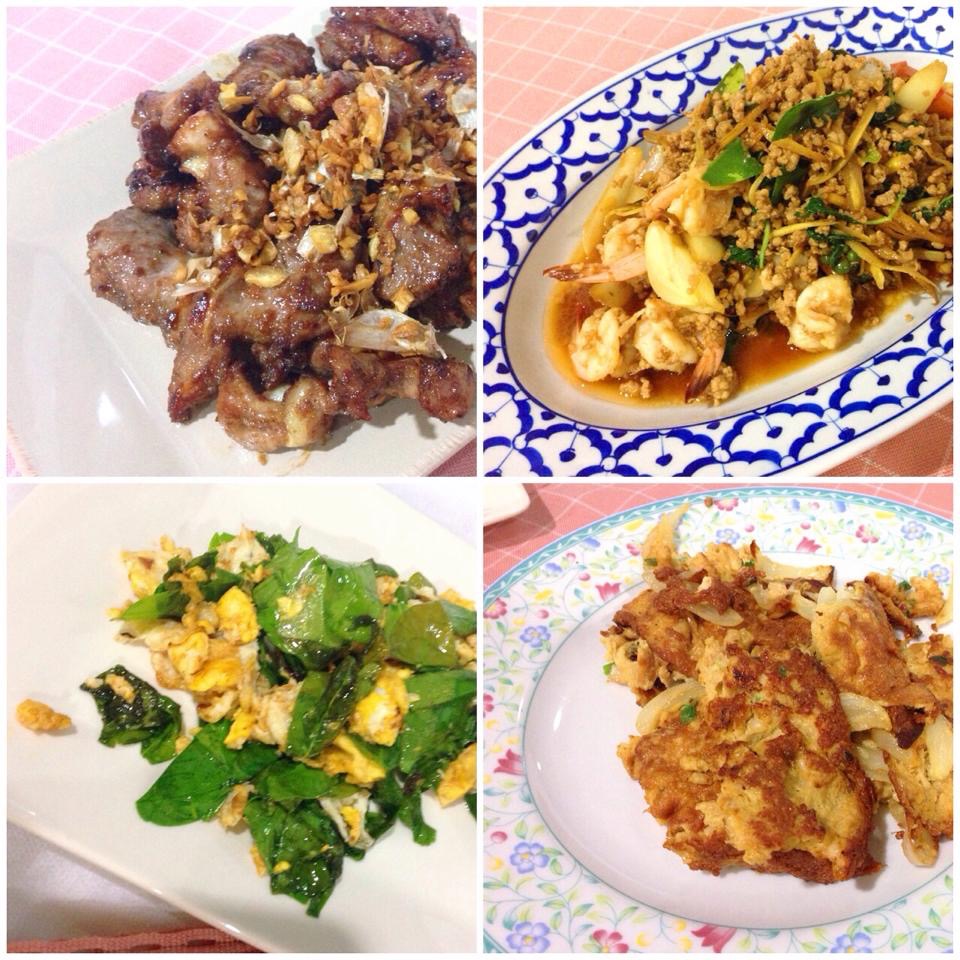 24. กระดูกอ่อนทอดกระเทียม + ผักเหลียงผัดไข่ + ไข่เจียวกุ้ง + หมูสับ&กุ้งผัดฉ่า