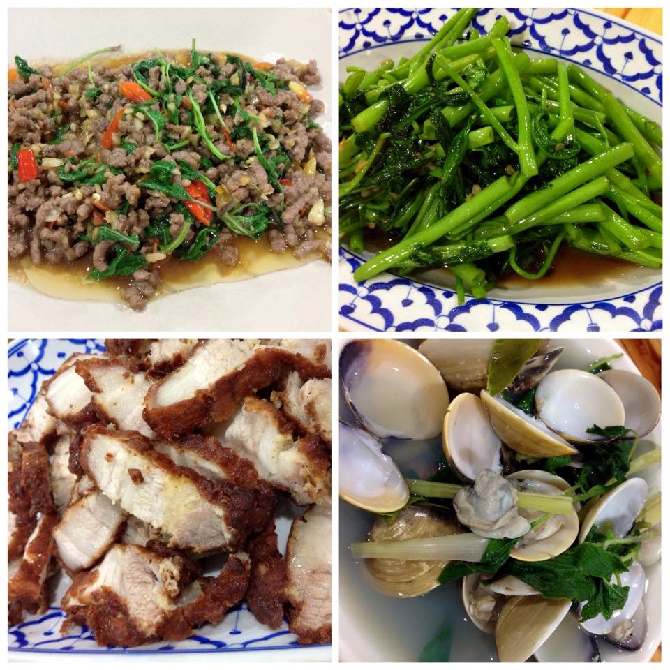5. กะเพราเนื้อสับ + ผัดผักบุ้งไฟแดง + หมูสามชั้นทอดน้ำปลา + หอยตลับต้มตะไคร้