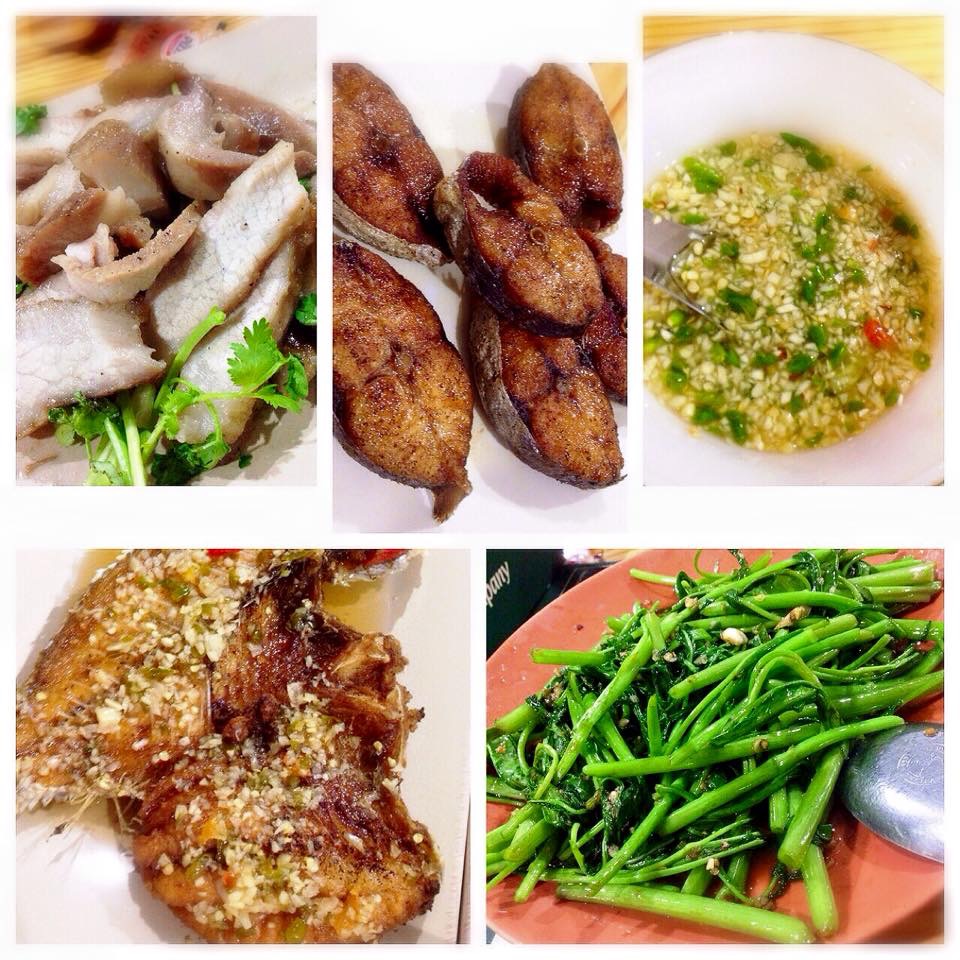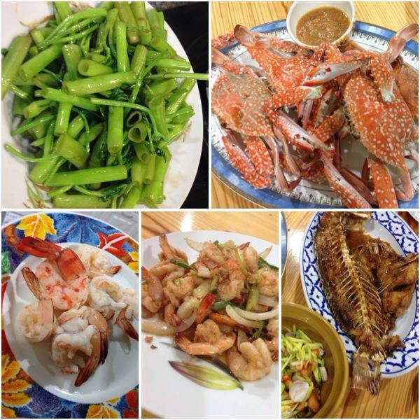 18. ผัดผักบุ้งไฟแดง + ปูนึ่งน้ำจิ้มรสแซ่บ + กุ้งลวกจิ้ม + กุ้งผัดกะปิ + ปลากะพงทอดน้ำปลา