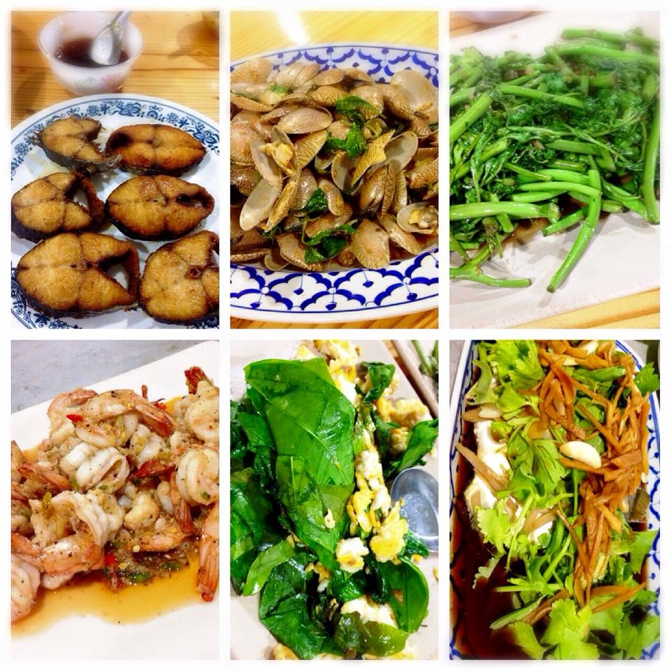 9. ปลาอินทรีย์ทอดน้ำปลา + หอยลายผัดฉ่า + ผักกระเฉดผัดน้ำมันหอย + กุ้งคั่วเกลือ + ผักเหรียงผัดไข่ + ปลานวลจันทร์นึ่งซีอิ๊ว