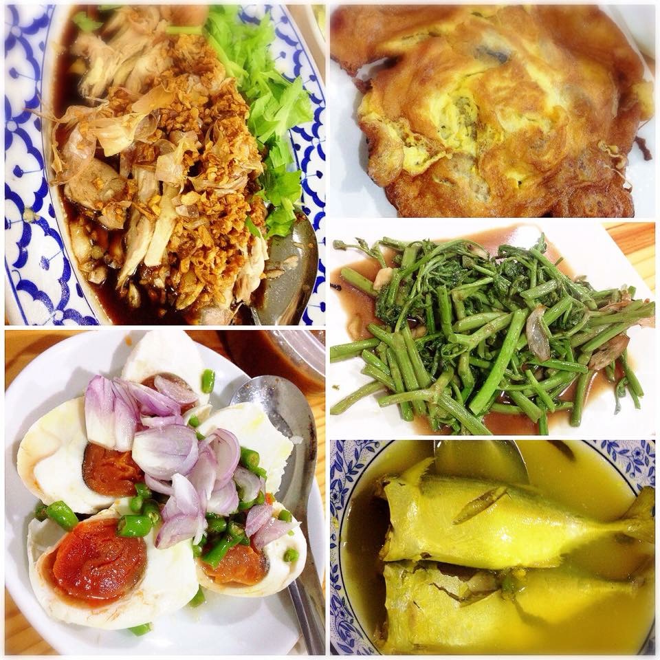 12. ไก่เบตง + ไข่เจียวไส้อั่ว + ยำไข่เค็ม + ผักกระเฉดผัดน้ำมันหอย + ปลาทูต้มส้ม