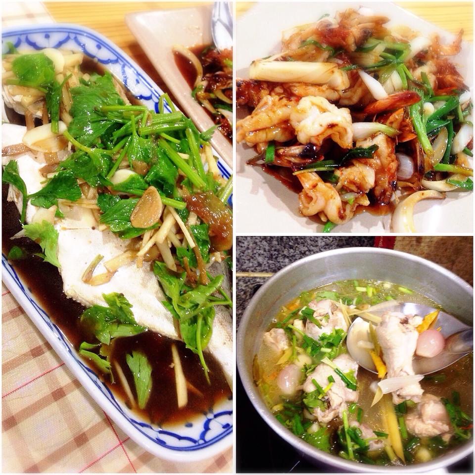 16. ปลานวลจันทร์นึ่งซีอิ๊ว + กุ้งผัดซอสมะขาม + ปีกไก่ต้มยำ