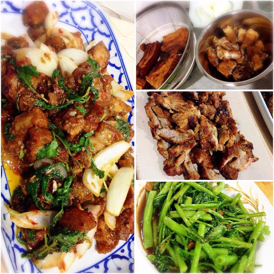 17. หมูกรอบทำเอง ต่อด้วยกะเพราหมูกรอบ + หมูอบเกาหลีพริกไทยดำ + ผัดผักบุ้งไฟแดง