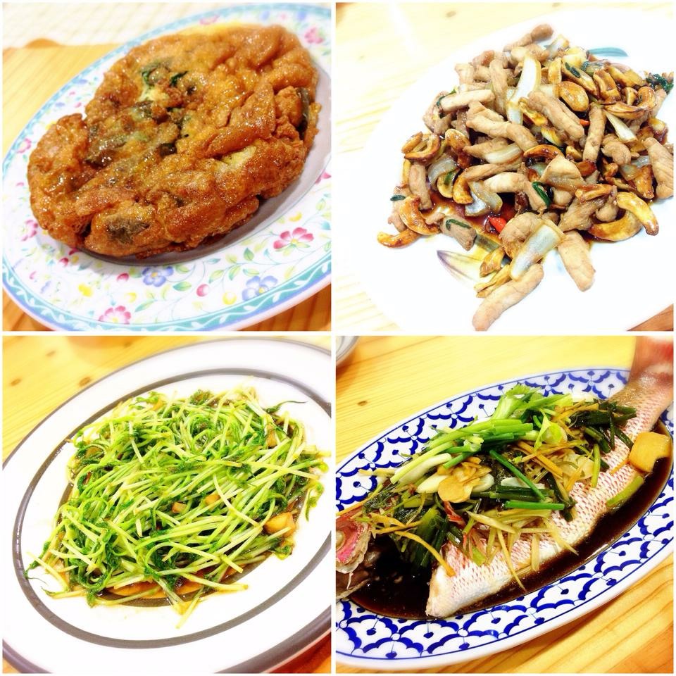 22. ไข่ฟก (อาจจะไม่ฟูเท่าที่ควร เพราะทำครั้งแรก) + หมูผัดเม็ดมะม่วง + โต๊วเหมี่ยวผัดน้ำมันหอย + ปลากะพงแดงนึ่งซีอิ๊ว