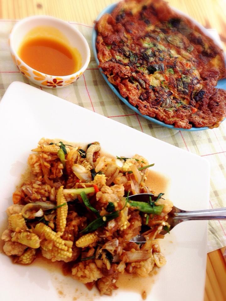 29. ไก่ป๊อบทรงเครื่อง (ทำมั่วๆแต่ดันอร่อยมาก) + ไข่เจียวสมุนไพร ใส่ผักหลายๆอย่างมั่วๆ