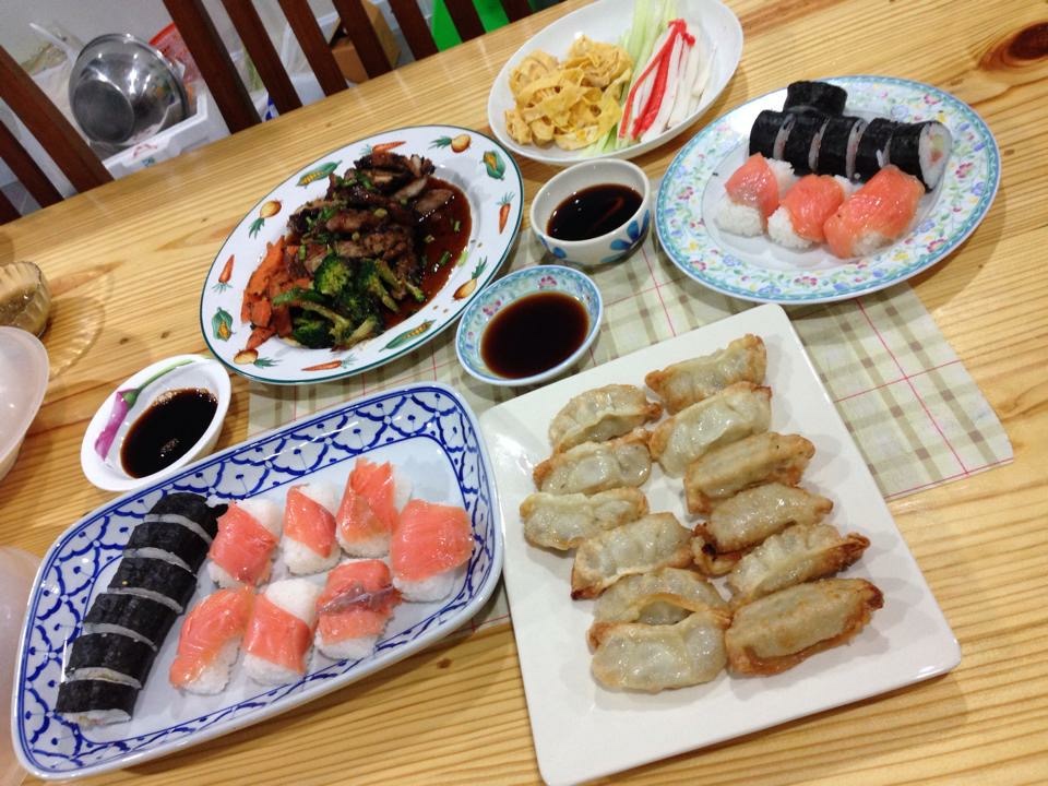 30. ซูชิทำเองมั่วๆ เนื่องจากเราชอบทานอาหารญี่ปุ่นมาก นางเลยจัดให้ + หมูย่างผัดซอสญี่ปุ่นใส่บล๊อคเคอรี่&แครอท + เกี๊ยวซ่า (ซื้อมาทอด)
