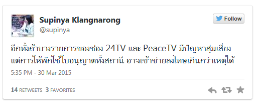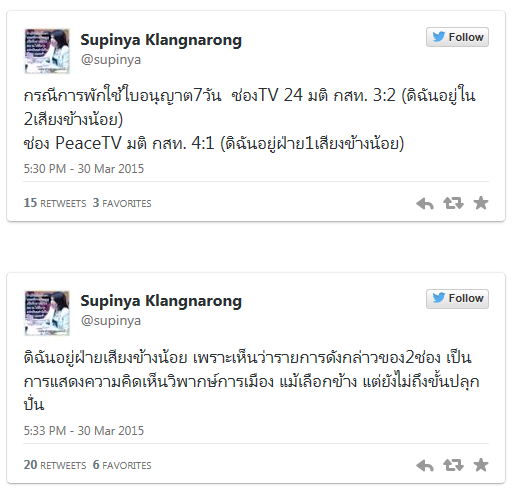 นางสาวสุภิญญา กลางณรงค์ หนึ่งในคณะกรรมการกิจการกระจายเสียง กิจการโทรทัศน์ และกิจการโทรคมนาคมแห่งชาติ หรือ กสทช. ทวีตข้อความผ่านทวิตเตอร์ส่วนตัวกรณีมติ กสท. สั่งพักใบอนุญาตออกอากาศเป็นเวลา 7 วัน ของสถานีโทรทัศน์ PeaceTV และ 24 ทีวี เนื่องจากนำเสนอเนื้อหาที่สร้างความสับสน เข้าข่ายปลุกปั่น ยั่วยุ เกิดความขัดแย้งในบ้านเมือง และขัดต่อประกาศคณะรักษาความสงบแห่งชาติหรือ คสช. ว่าเธออยู่ในกลุ่มเสียงข้างน้อย