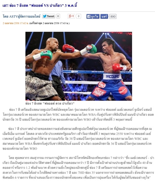 ช่อง 7 สี เตรียมยิงสดมวยซูเปอร์ไฟต์นัดหยุดโลก รุ่นเวลเตอร์เวท ระหว่าง ฟลอยด์ เมย์เวตเทอร์ จูเนียร์ แชมป์โลกรุ่นเวลเตอร์เวท ของสภามวยโลก WBC และสมาคมมวยโลก WBA กับคู่ปรับชาวฟิลิปปินส์ แมนนี ปาเกียว ยอด