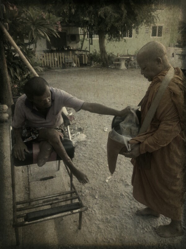 โดยปกติแล้วแกคนที่ใส่บาตรจะไปหยิบนมที่รร.แจกเด็กในบ้านแก เด็กไม่กิน แกเลยเอานมมาใส่บาตร