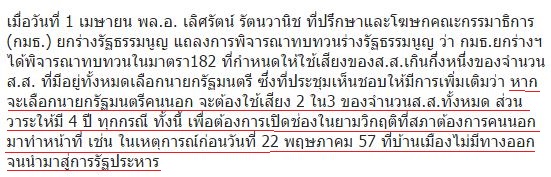เราควรเขียนเปิดช่องเพียงว่า ถ้าจะเอานายกคนนอก ต้องให้ประชาชน เกินกึ่งหนึ่งของประชาชนที่มีสิทธิ์ทั้งประเทศ ณ เวลานั้นๆ ลงคะแนนรับรอง แล้ว ถ้าการลงคะแนนรับรองของคนที่มีสิทธิ์ทั้งประเทศได้ไม่เกินกึ่งหนึ่งก็ให้มีการเลือกตั้งใหม่ แบบนี้ถึงจะแฟร์กับประชาชนชาวไทย ไม่ใช่จะเอาแต่ใจไม่เห็นความสำคัญกับประชาชน