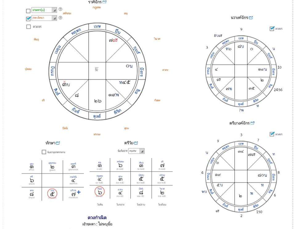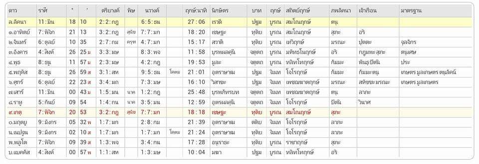 บุคคลที่ 1 : ลัคนาสถิต ราศีมีน เกาะนวมนวางค์ ๕ มีน ตติยตรียางค์ ๓ พิจิก เกี่ยวเรวดีนักษัตรฤกษ์ที่ ๒๗ ประกอบไปด้วยสมโณแห่งฤกษ์ ดาวศุกร์(๖) ราศีพิจิก(๗) เป็นตนุเศษ บุคคลที่ 2 : ลัคนาสถิต ราศีพิจิก