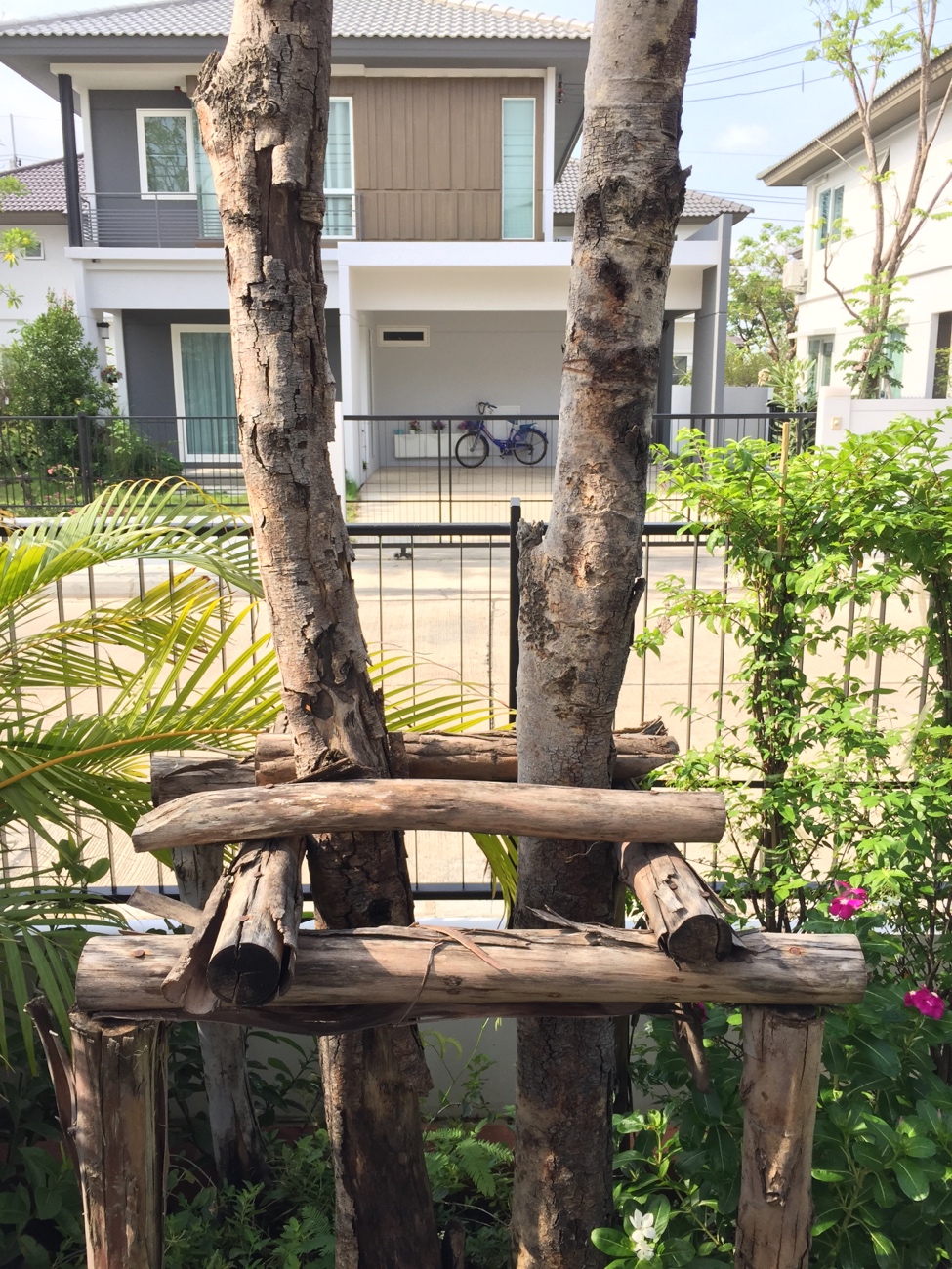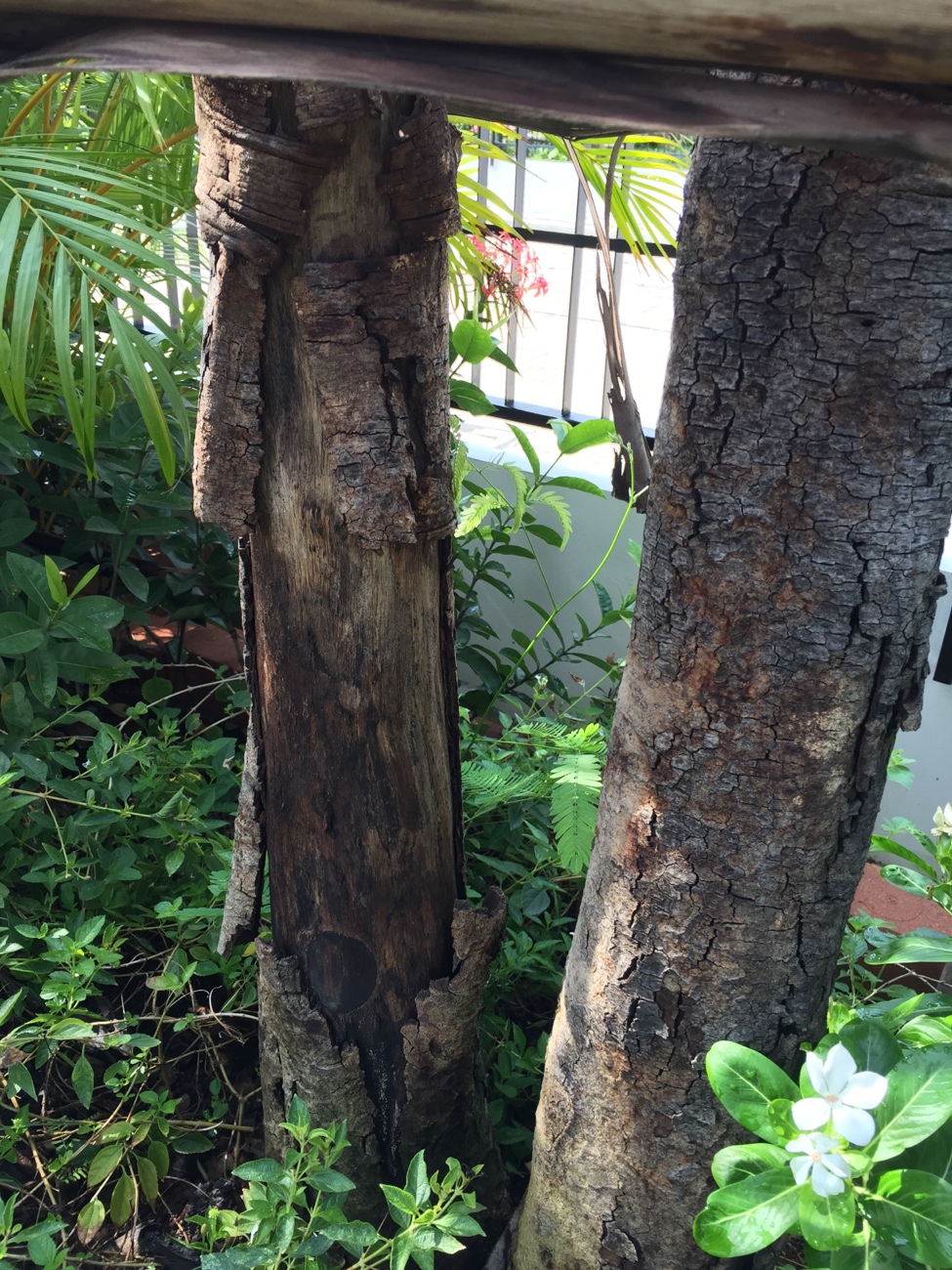 ต้นด้านขวาเปลือกไม้มีอาการร่อนไปหนึ่งแถบ แต่ยังมีใบมีดอกออก