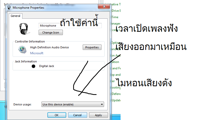 วิน 7 เวลาปรับค่า ไมโคโฟนพอพเพอตี้ เป็น use this device เสียงเพลงทีออกมาจะเป็นเสียงไมหอนเสียงดัง