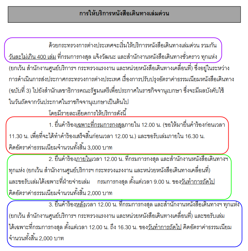 กระทรวงการต่างประเทศเตรียมเปิดให้บริการทำหนังสือเดินทางต่างประเทศแบบเร่งด่วน วันละไม่เกิน 400 เล่ม โดยสามารถทำได้ทุกที่ยกเว้นที่ กระทรวงแรงงาน และหน่วยเคลื่อนที่โดยมีให้เลือก 3 รูปแบบ 1. ทำที่กรมการกง
