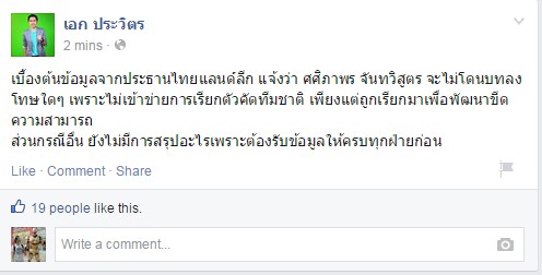 จาก Facebook คุณเอก ... ไม่รู้ว่าเข้าใจถูกต้องไหม ถ้าเป็นยังงั้นจริงก็ถือว่าน้องไม่มีวาสนาละกัน ฝีมือประจักษ์ คุณสมบัติได้ กองเชียร์สนับสนุน แต่แค่จะได้เข้าไปคัดตัวเป็น 1 ในแคมป์ยังไม่มีสิทธิ์ เป็นเราถอดใจกับทีมชาติ แล้วไปเล่นลีกเพื่อนบ้านรอเวลาประจวบเหมาะขอโอนสัญาติไปเป็นหัวหมาที่อื่น ยังดีกว่ารอเป็นหางราชสีห์ที่ไม่แน่นอนแบบนี้ดีกว่า