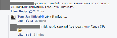 หลังจากที่จาตกลงไปในปล่องลิฟท์ ก็คิดกันไปต่างๆนานๆว่าจาน่าจะตายแล้ว แต่ไปเห็นในแฟนเพจของจามา เอ๊ะหรือแกจะยังไม่ตาย ขอให้กลับมาแล้วขอบทพูดเยอะๆหน่อยนะ อีกอย่างอยากให้สู้ข้างๆ Statham ไปเลย น่าจะเท่ไม่เบา