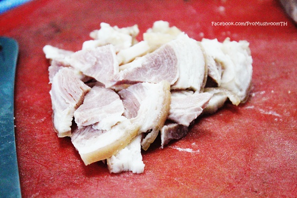 1.หั่นแฮมขาหมูให้มีชิ้นขนาดขางพอดีคำ