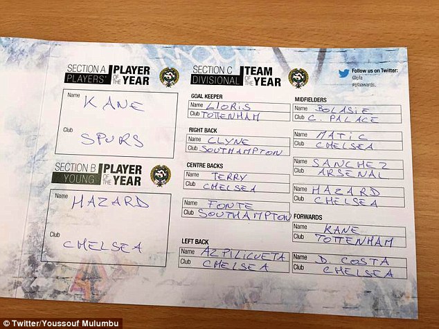 ยูซุฟ มูลุมบูกองกลางของเวสต์บรอมวิช อัลเบี้ยนได้เผยผ่านทวิตเตอร์ว่าเขาเลือกลงคะแนนโหวตแฮร์รี่ เคนให้เป็นนักเตะยอดเยี่ยมแห่งปีของพีเอฟเอและเลือกเอแด็ง อาซาร์เป็นดาวรุ่งยอดเยี่ยมแห่งปี
