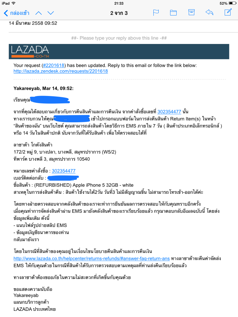 เช้าวันจันทร์(16 มี.ค.)โทรไปสอบถาม lazada ซึ่งเจ้าหน้าที่ก็แจ้งว่าได้รับของคืนแล้ว ผมจึงย้ำว่าให้ส่งเมลมาแจ้งด้วย แต่เมลที่แจ้งลงบันทึกว่าได้รับของวันที่ 17 มี.ค. ถึงจุดนี้ผมเริ่มสังหรณ์ใจซะแล้วสิ
