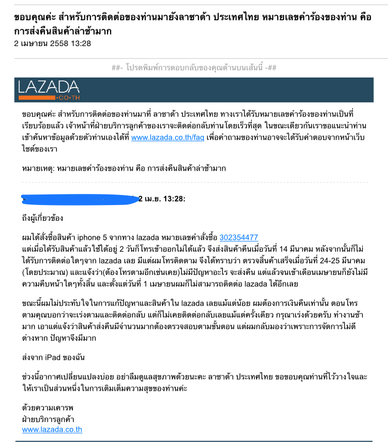 ได้รับของในวันที่ 11 มี.ค. เป็นของนำเข้าจากฮ่องกง ก็ไม่ได้คิดอะไร กลับบ้านลองใช้งานก็ใช้ได้เป็นปรกติ ชาร์ทไฟเข้าปรกติ พอใช้ไปได้ 1 วัน เข้าวันที่ 13 ตอนแบตใกล้หมด ก็เลยเสียบสายชาร์ท ใช้เวลาชาร์ททั้งหมดประมาณ7ชั่วโมงแบตถึงเต็มระหว่างที่ชาร์ทเครื่องก็ขึ้นสัญญาญ searching ตลอด อีกทั้งโทรเข้าออกไม่ได้เลย จึงรีบแจ้งไปทาง lazadaในเวป รุ่งขึ้นก็มีเจ้าหน้าที่ติดต่อมาทันที (ตอนแรกแอบประทับใจว่าทำงานดี ไม่เห็นเหมือนที่เขาด่าๆกันในเวปเลย) ทาง lazada ก็แจ้งว่าให้กรอกแบบการคืนสินค้าและให้ส่งคืนสินค้ากลับโดยเร็วเพราะเกรงว่าจะเกิน 14 วัน ระหว่างนั้นก็และยังแจ้งด้วยว่าถ้าได้รับของจะมีเจ้าหน้าที่ติดต่อกลับไป(ซึ่งหลังจากครั้งนี้ที่ lazada ติดต่อผมมา เป็นครั้งสุดท้ายที่ผมได้รับการติดต่อจาก lazada หลังจากนี้ไป ผมเป็นคนติดต่อเข้าไปทั้งสิ้น)