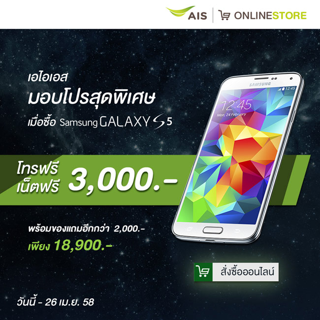 พอดีกำลังดู Samsung GALAXY S5 เห็นที่ทาง Samsung กับ Ais จัดโปรอยู่ ซื้อผ่าน Ais online ได้ค่าโทรและค่าเน็ตฟรี 3,000 บาท บวกของแถม (ตามลิงค์) http://store.ais.co.th/th/mobile-phone/samsung/samsung-galaxy-s5.html