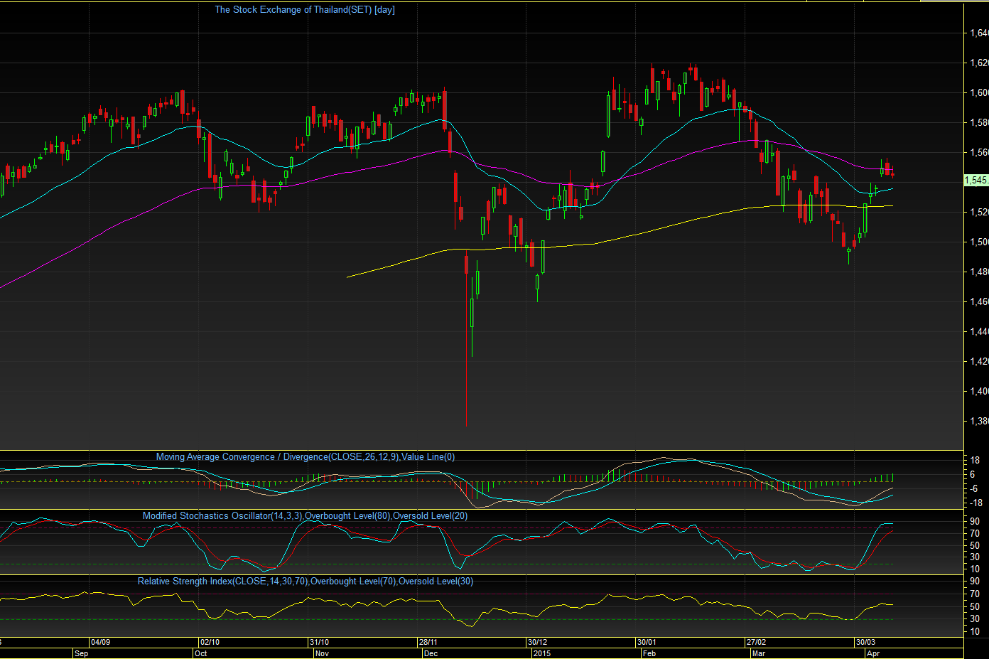 SET index TF Day : เมื่อวานแกว่งตัวในกรอบแคบๆ ( 1542 - 1550 ) และช่วงท้ายตลาดปิดตัว หลุดเส้น EMA75 วัน ลงไป ให้ระวังวันนี้