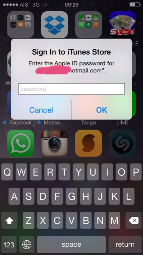 ปัญหาเกิดตอน เข้า app store เพื่อจะกด update app จะมีหน้าต่างขึ้นมาให้ใส่ password ของ apple id ซึ่ง apple id ที่โชว์ในหน้าต่างนี้ ไม่ใช่ apple id ที่ลงไว้ในเครื่องนี้ ณ ปัจจุบัน