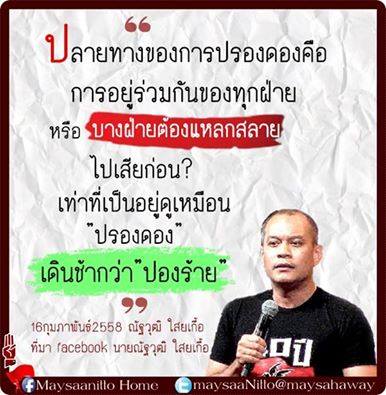 งงมั้ย คนระดับชั้นนำมีความรู้ดี การศึกษาดี มีหน้าที่การงานระดับสูงเงินเดือนเฉียดแสน เคยสอนการเมืองเพื่อนฝูงไปทั่วรู้หมดทุกอย่าง จำนำข้าวเสียหายอย่างไร ทำผิดตรงไหน ขั้นตอนมันไม่ถูกต้องอย่างนั้นอย่างนี้ พอมาวันนี้ ถามมันเรื่องการเมือง มันบอกไม่อยากสนใจปวดหัว นี่แหละพวกคอสลิ่ม พวกเกลียดชัง ยิ่งลักษณ์ พวกเกลียดทักษิณ มันเป็นอย่างนี้ คนดีทั้งนั้น