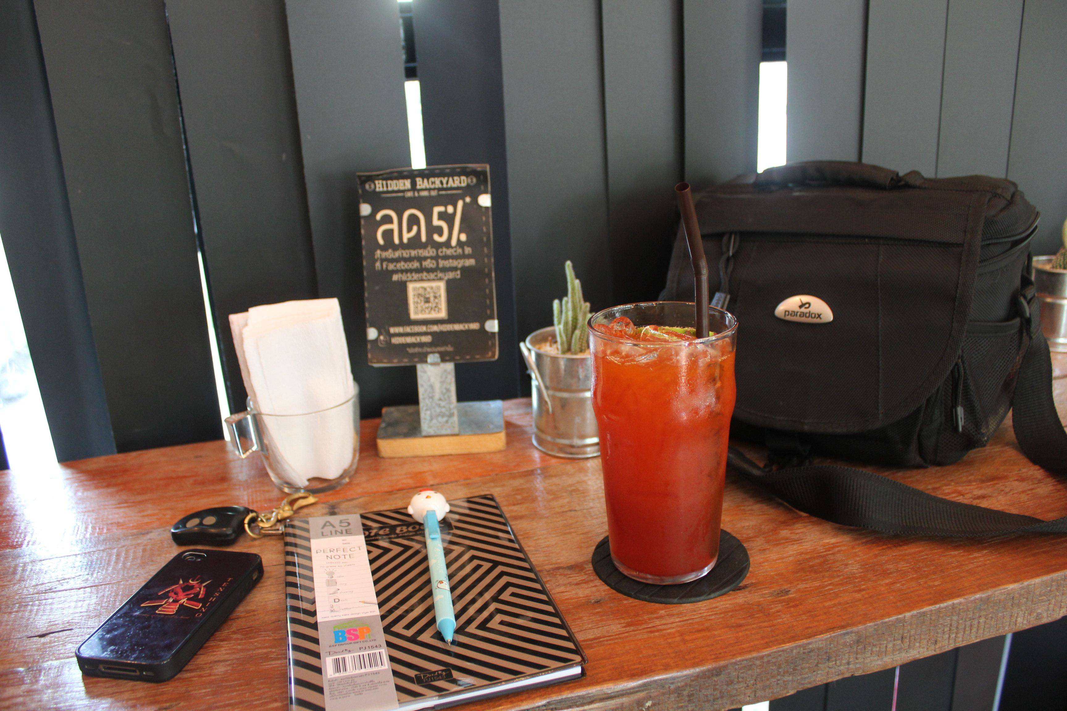 อาหารของที่นี่จะเป็นอาหารฝรั่งจานเดียว เช่น สเต็ก พาสต้า มีเมนูข้าว แล้วก็พวกยำต่างๆ รวมถึง เมนูทานเล่นครับ นอกจากนี้ที่นี่ยังมีเบียร์นำเข้าหลากหลายสไตล์หลายยี่ห้อ โดยมีเบียร์สด 2 tap จากเบลเยี่ยม เป็น Wheat และ Amber Ale ครับ มีเบียร์ขวดอีกเกือบๆ 20 ชนิด แล้วก็ยังมี Sangria กับ Shandy สูตรพิเศษของทางร้านด้วยครับ ผมว่ามันแบบสำหรับคนมาเป้นคู่ไง แต่ผมมาคนเดียว แบบพาแฟนมาดินเนอร์ไรเงี้ยเพราะกลางคืนสวยมากก ผมมาคนเดียวอะสั่งแบบคนโสด สั่ง lced lamon tea มา1 แก้ว