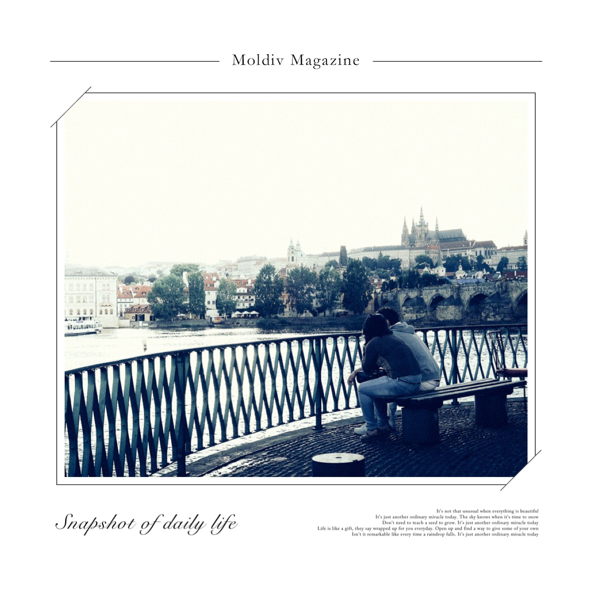 เราสองคนอยู่บนสะพานมองผ่านไปเห็นปราสาทปร๊ากอยู่ฝั่งตรงข้าม อากาศยามเช้าสดชื่น มีคนใส่ชุดแต่งงานมาถ่ายรูปอยู่ไกลๆ มีคนจูงหมามาเดินเล่น มีคนมาวิ่งเล็กน้อย และมีข้าพเจ้ากับภรรยายืนกินแซนวิชที่ทำเองอยู่ ทั้งสะพานมีคนแค่นี้ ให้สามคำ