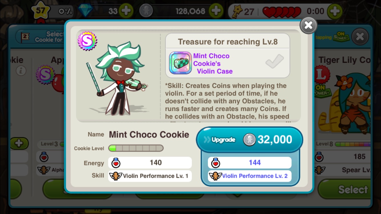 ผมลองสุ่มไปเรื่อย ๆ แล้วได้พลังพิเศษมามากมาย เช่น double coin, x2 EXP บลา ๆ ๆ แต่บางครั้งก็จะได้พลังพิเศษของคุ้กกี้ตัวอื่น ๆ มา เช่น invincibility 70% (นักกล้าม), crash take less damage 30% (เจ้าหญิ